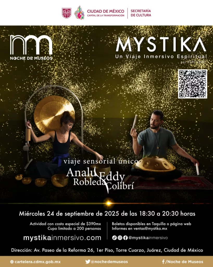 En el marco de la Noche de Museos, Mystika Inmersivo abre sus puertas a una experiencia única que une arte, música y vibración sonora para invitar a los asistentes a reconectar consigo mismos. La velada estará guiada por Eddy Colibrí y Analu Robleda, terapeutas sonoros y facilitadores de experiencias de sanación a través de la música, quienes conducirán un Baño Sonoro y de Gong diseñado para inducir estados de profunda relajación, equilibrio emocional y bienestar integral.