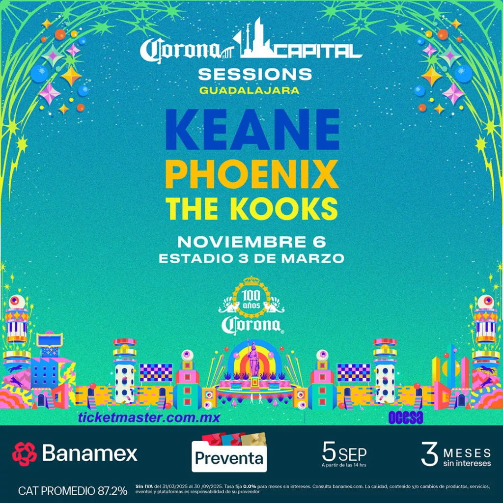 Como parte de los festejos llega Corona Capital Sessions, un nuevo concepto que viene a ofrecer a los fans del festival del interior de la República Mexicana con una serie de shows que prometen ser simplemente increíbles e inolvidables. El inicio de estos eventos será en Guadalajara el próximo 6 de noviembre y donde se presentará Keane, Phoenix y The Kooks; continuando el 8 de noviembre en Mérida y nuevamente teniendo la perticipación de Keane, Phoenix y sumando a Passion Pit; y finalizando en Monterrey el 12 de noviembre con la participación de Foo Fighters, Queens Of The Stone Age y Jehnny Beth.