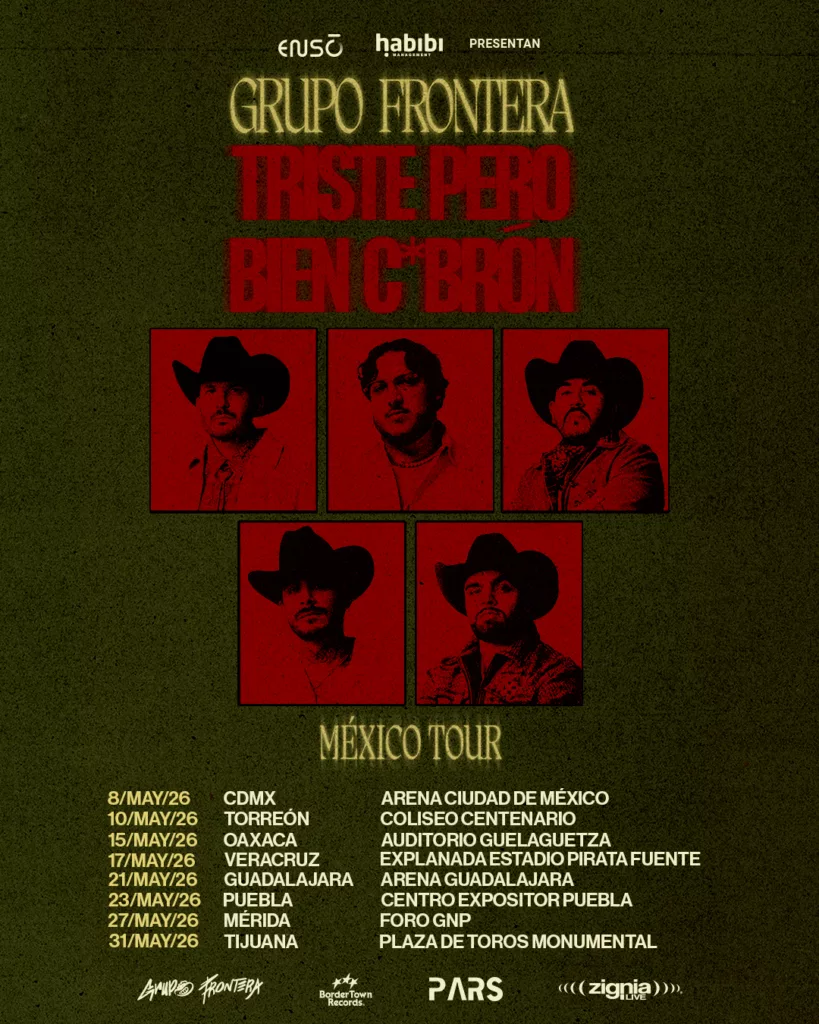 Durante el 2024, Grupo Frontera marcó un antes y un después en su trayectoria, ahora, la agrupación vuelve a los escenarios con una gira que promete ser de las más comentadas del próximo año. El “Triste Pero Bien C*brón Tour” marca el regreso oficial de la agrupación después de recibir reconocimientos internacionales y conquistar audiencias en distintos continentes. Este tour acompaña el lanzamiento de su nuevo álbum “Lo Que Me Falta Por Llorar”, un proyecto que mantiene su esencia norteña-cumbia mientras explora emociones más profundas y una narrativa más madura, conectada directamente con su público.