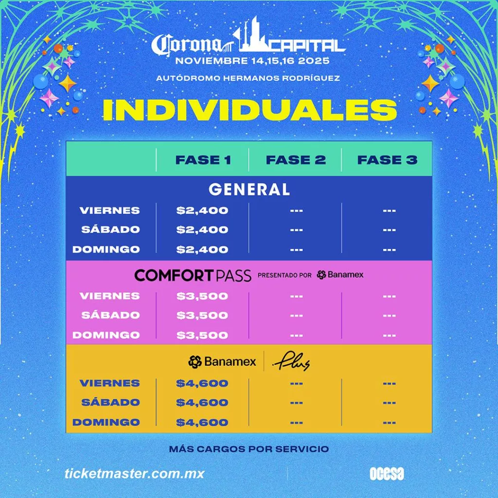 - General: Este acceso te incluye la entrada al 15° aniversario del Corona Capital, la presentación de todas las bandas que forman parte del line up en los diferentes escenarios, activaciones de marca, venta de alimentos/bebidas y baños generales.