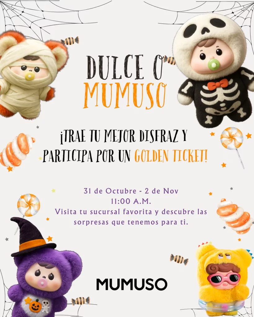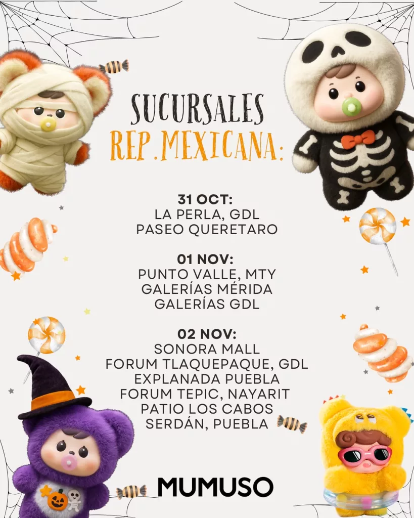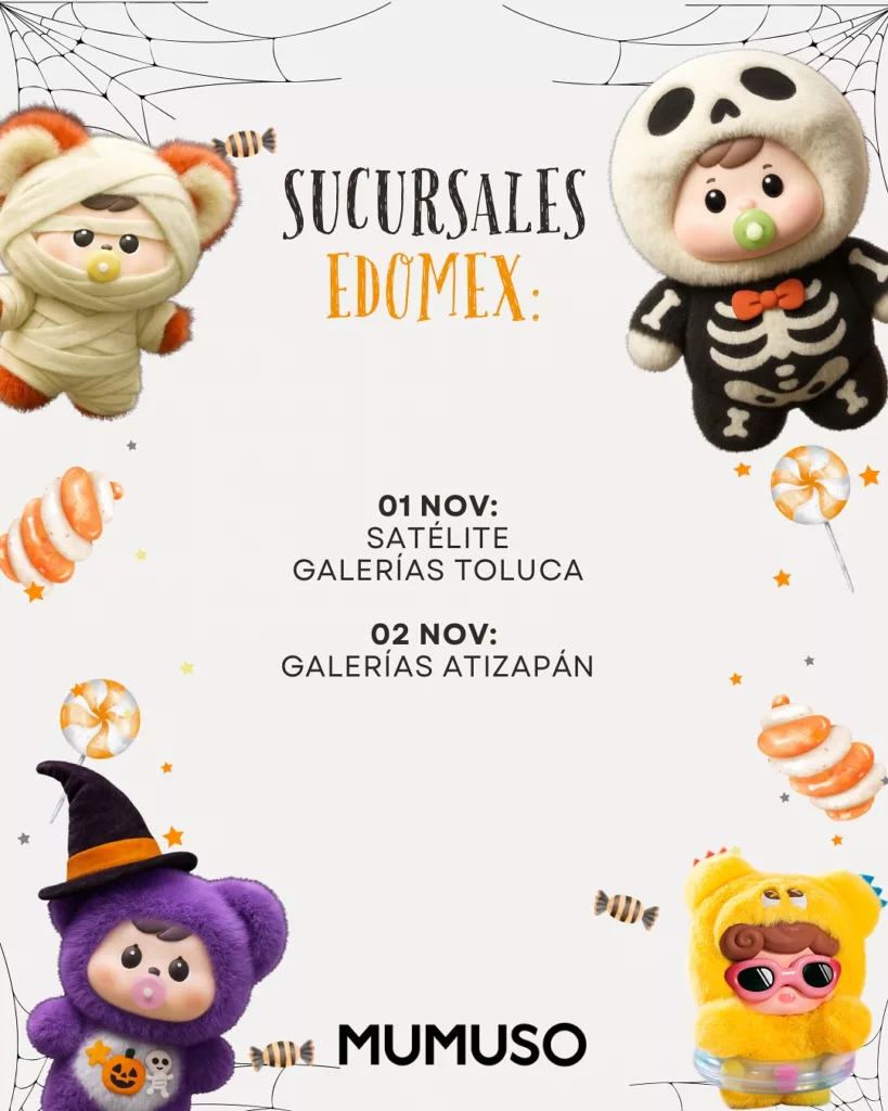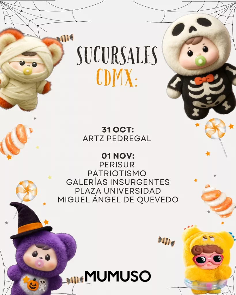 Entre las tiendas donde podrás vivir esta experiencia están Satélite, Perisur, Patriotismo, Plaza Universidad, Galerías Toluca, Punto Valle Mty, Andamar, Explanada Puebla, Forum Tlaquepaque, Sonora Mall, Patio Los Cabos, Galerías Gdl, Artz, Andamar entre otras. Así que ya sabes, si este Halloween quieres algo más que solo dulces, lánzate a Mumuso y celebra entre premios y mucha diversión kawaii.